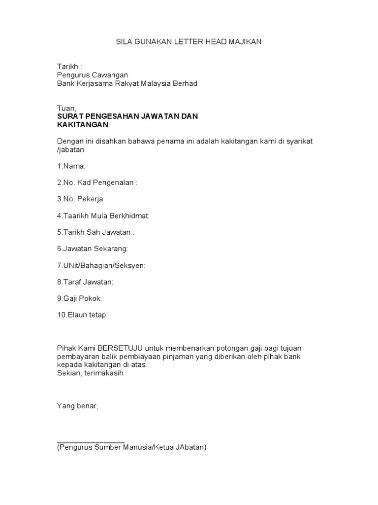 Format surat confirmation daripada majikan untuk tujuan pinjaman beli rumah sambung belajar dan sebagainya. Seorang pengguna persendirian bernama test ting. Kebiasaannya pengesahan ini dilakukan dalam tempoh sebulan hingga 6 bulan dan mungkin menjadi lebih lama bergantung.